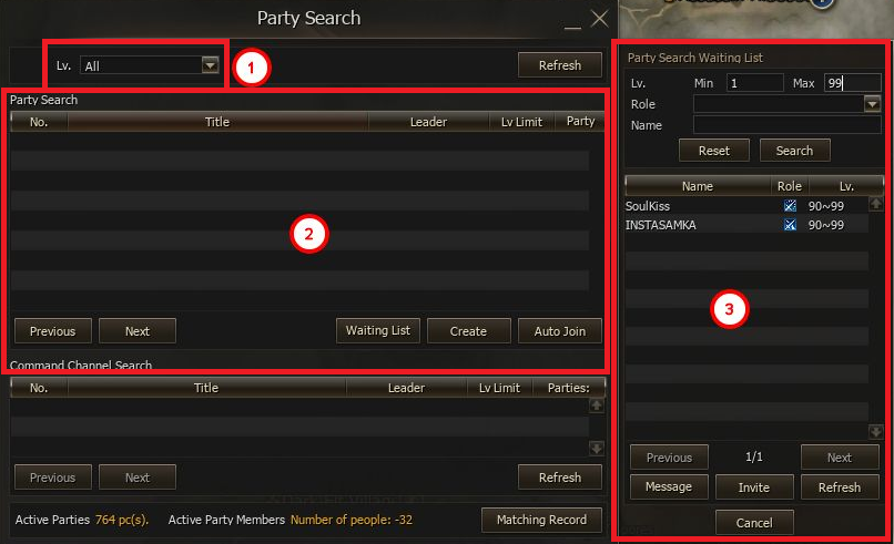 • The top of the list allows you to set search conditions: Level Range, Role, and Character Name.